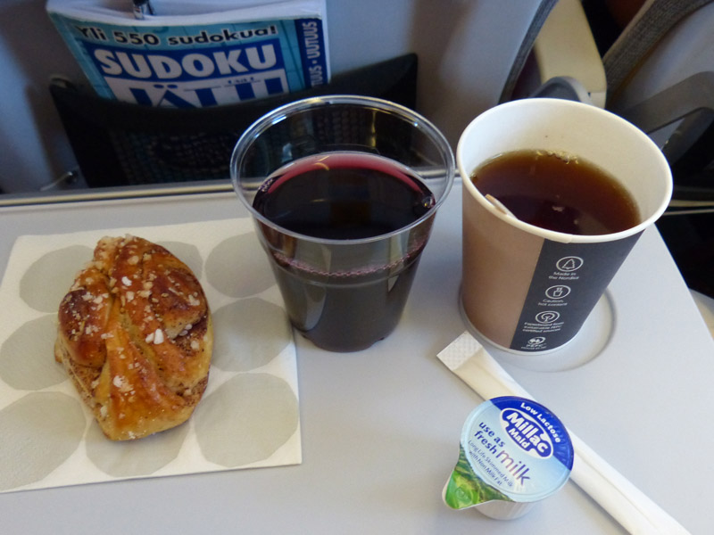 Finnairin tarjoama mustikkamehu ja tee, oma korvapuusti eväänä
