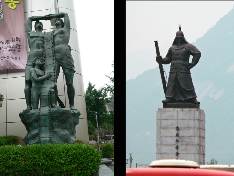 Vasemmalla mikälie-patsas, oikealla 1500-luvun sotasankari amiraali Yi Sun Shin
