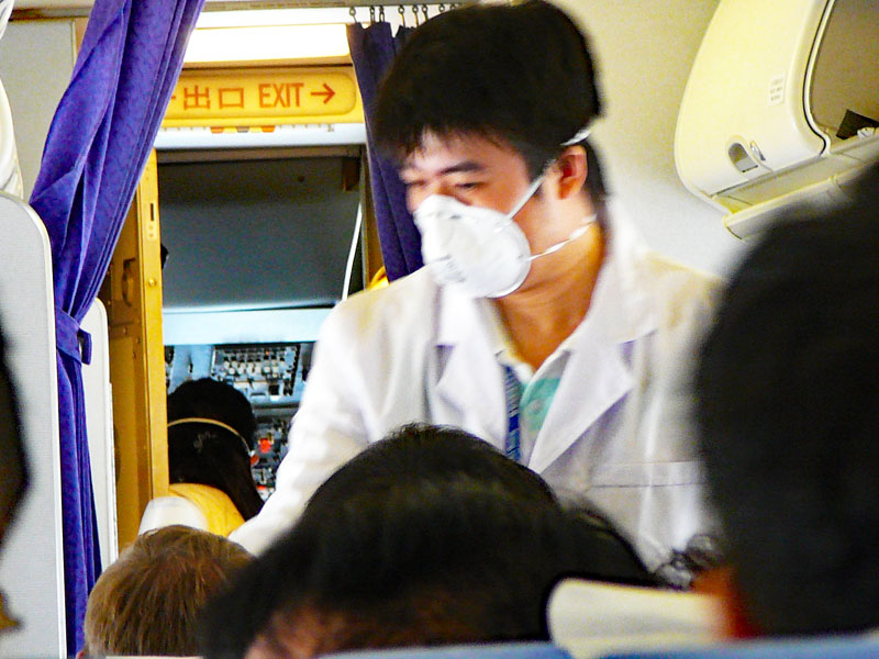 Lääkärihoitajat tulivat koneeseen mittaamaan kuumeen jokaiselta joka kerta Pekingiin tultaessa.