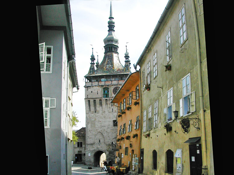 Sighisoaran pääportin yläpuolella on 64 metriä korkea kellotorni 1300-luvulta. Sen oikealla puolella olevaa keltaista rakennusta pidetään Draculan esikuvaksi väitetyn hirmuhallitsija Vlad Tepesin synnyinkotina. Nautimme siellä lounaan. Keskiviikko 31.8.2005 |