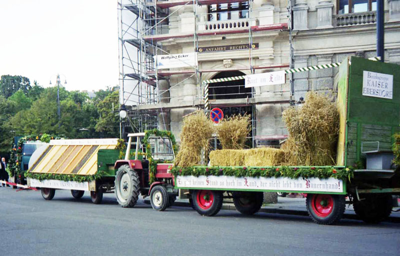 Lyhtein, kukin ja köynnöksin koristeltuja ajoneuvoja. Kaiketi elonkorjuujuhla tulossa?