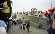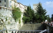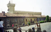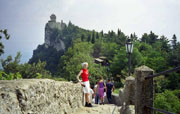 Maanantai 19.8.2002 - Cattolica-San Marino-CattolicaAamupäivän shoppailun jälkeen lähdimme "ulkomaille" eli San Marinoon, jossa vierailee noin 3 miljoonaa muutakin turistia joka vuosi. Pääkaupungin San Marinon muurien sisäpuolella asuu ainoastaan 10 perhettä, muuten se on täynnä kirkkoja, museoita, liikkeitä ja ravintoloita. Teimme ensin kävelykierroksen kaupungissa oppaan johdolla, minkä jälkeen kiipesimme Rocca- ja Cesta-linnoitustorneille. Hikisen urakan jälkeen Fanta, olut ja paahtoleipä maistuivat. Hankimme makoisaa kermalikööriä tuliaisiksi ja postitimme pari korttia. Taivaalta ripotteli muutama virkistävä pisara vettä. Bussimme lähti takaisin Cattolicaan puoli kuudelta, ja olimme hotellissa seitsemältä. |