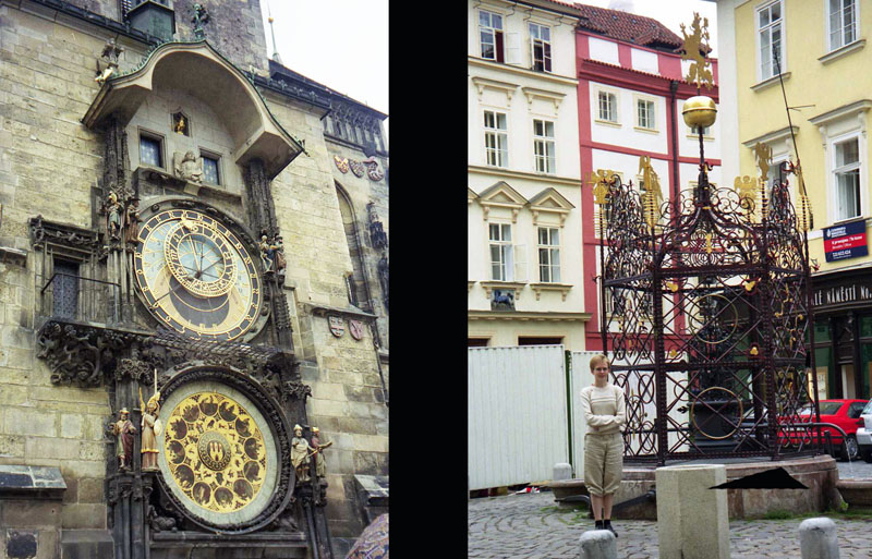 Vasemmalla raatihuoneen kello, oikealla suihkukaivo Pienellä aukiolla
