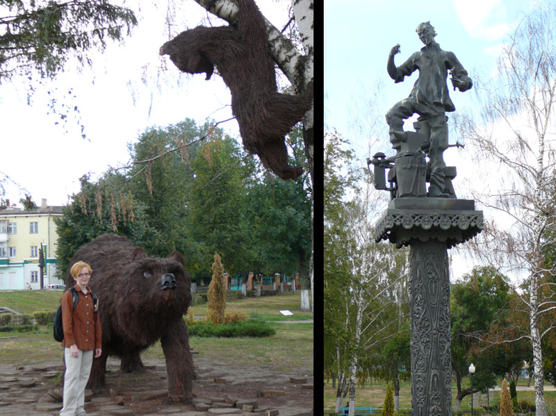 Emokarhu ja pikkukarhu sekä kierosilmäinen seppä Leskovin puistossa. Koivun oksista