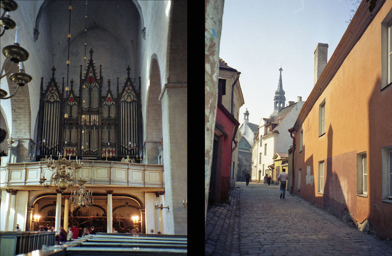 Tuomiokirkko sisältä ja kapealta kadulta kuvattuna